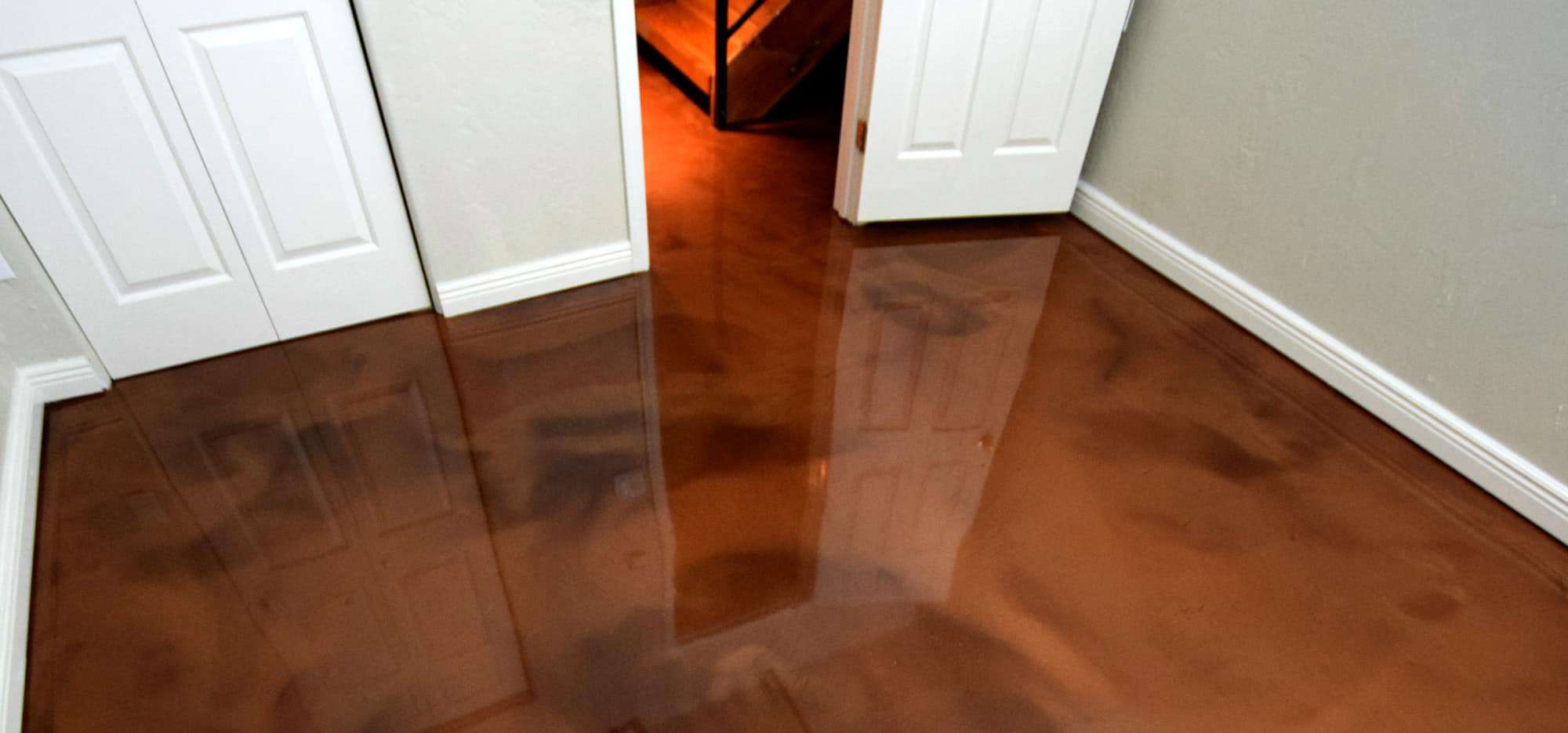 A generous layer of epoxy primer is used in constructing our metallic floors (we never directly apply polyurea or polyaspartic onto concrete), subsequently coated with a vibrant metallic color coat, and finished off with a protective clear topcoat. Although stunning systems, these concrete coatings aren’t advised for garages or areas exposed to any vehicular traffic, but are perfect fits for kitchens, basements, corridors and living rooms.